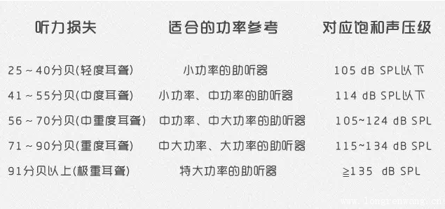 国际上把根据助听器的饱和声压级分为五类:小功率(105dB SPL以下),中功率(105~114dB SPL),中大功率(125~134dB SPL),大功率(125~134dB SPL),特大功率(135dB SPL以上)。